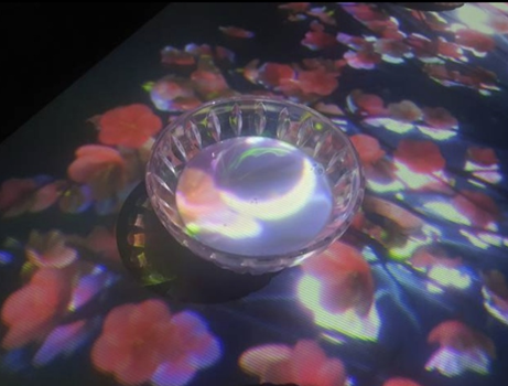 테이블 위에 잔을 올리면 꽃이 피어나는데 컵을 움직이면 꽃이 따라 움직입니다.